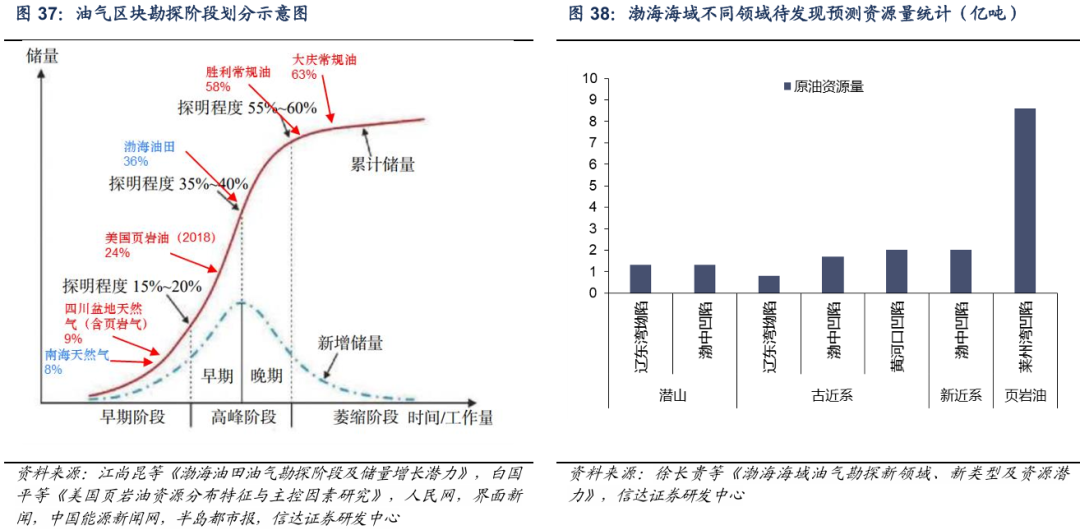 截至2023年,渤海油田上报探明石油天然气储量当量超过50亿吨,“十三五”期间的油气资源评价结果表明,渤海油田的总资源量约为140亿吨,渤海油田当前油气资源储量探明率为36%,正处于储量发现高峰阶段。国内外近海油气含油气盆地及渤海湾盆地陆上油田的勘探实践表明,勘探高峰阶段结束时油气勘探程度通常可达 56%~80% 以上,如国外墨西哥湾中西部浅水区、国内胜利油区勘探高峰晚期阶段结束时探明程度分别为58%、68%以上,渤海海域油气资源基础雄厚,油气勘探仍具有很大的潜力,未来勘探或将继续向中深层古近系、非常规、隐蔽性潜山转移,储量仍有望高速增长。