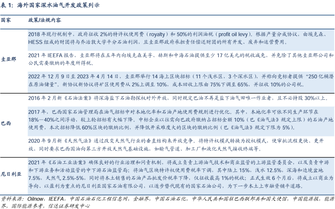 在政策方面,海外深水油田资源丰富的国家,如巴西、圭亚那、尼日利亚等均出台了一系列政策支持,激励油气公司加大对深水油气田的生产。圭亚那作为新兴海洋油气输出国,相比其他老牌产油国的政策更为优惠。在圭亚那2018年对埃克森美孚财团的税收政策中,政府仅征收2%的特许权使用费和50%的利润油税,据Rystad Energy估计,这种财政安排使得政府获得项目利润的60%,同期平均政府提成约为75%,而其他主要的海上生产国家(如尼日利亚、挪威、墨西哥、印度尼西亚和特立尼达)均高于80%。开采企业在圭亚那盈利比更大。不过,在2022年新一轮招标中,圭亚那已经提高了矿权使用费。巴西和尼日利亚均在过去几年均不同程度上下调了矿权使用费率。巴西在2016年后将深水石油勘探权对外开放,意味着巴西深海油气资源脱离国家垄断,同时巴西在2017年油气招标中对本地化率和石油产地使用费规则进行优化,海外企业有更多机会参与深水油气开发。尼日利亚油气区块特许权使用费按照陆上、浅水、深水依次下调,深海特许权使用费仅为7.5%。