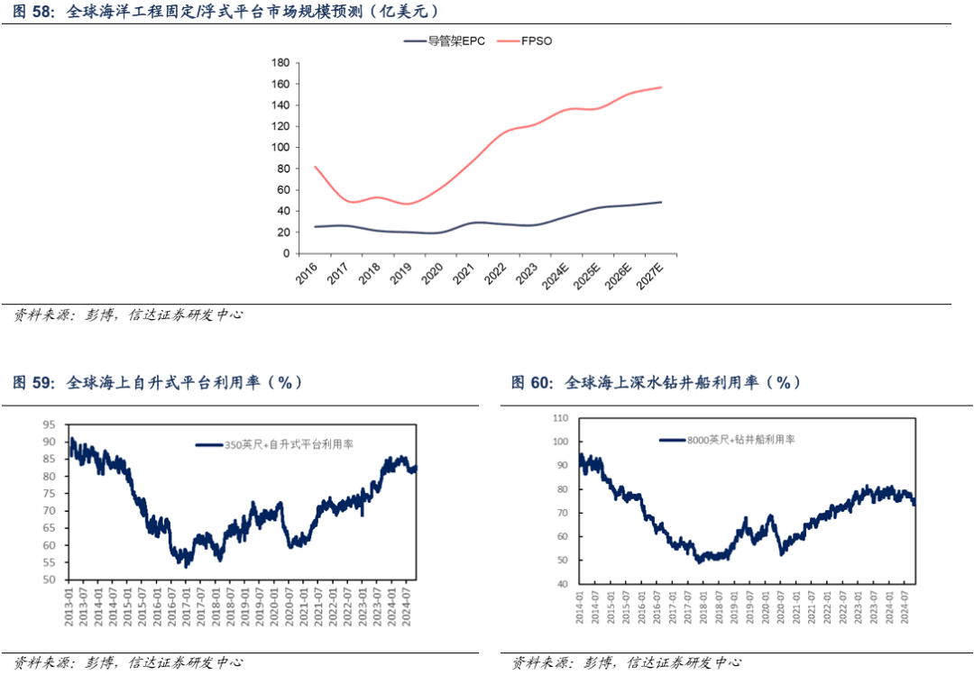 中高油价周期下,以及海洋资源开发背景下,相关建造需求、作业需求都处于景气上行过程中,未来有望较长时期延续。根据彭博数据,未来FPSO和导管架EPC的市场需求持续增长,特别是深水开发趋势下FPSO订单规模有望超越2013-2015年高油价市场黄金时期100-110亿美元的市场规模。