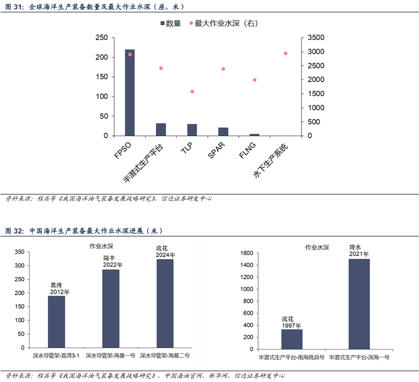 对于我国而言,2024年我国新建投产的亚洲第一深水导管架“海基二号”在南海陆丰油田服役,作业水深超过300m,盘活了陆丰15-1、流花11-1与陆丰12-3三大油田,使大量潜在的深水边际油田开发成为可能,同时可大幅降低开发投资、工程建设和生产成本。2021年我国建成全球首座十万吨级深水半潜式生产储油平台“深海一号”,支撑了陵水17-2深水自营大气田的开发,作业水深约1500m。