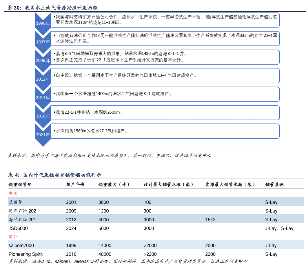2020年后,深水导管架和半潜生产平台作业水深逐步提升,带动我国南海地区深水油气勘探和开发进程(包括流花油田群、陆丰油田群、陵水气田群、荔湾气田群等)加快。而近2年南海地区重大发现如开平南油田、陵水气田群、荔湾气田群等水深均在500米甚至1500米以上,因此深水作业能力提升或将带动我国深水油气资源的开发。