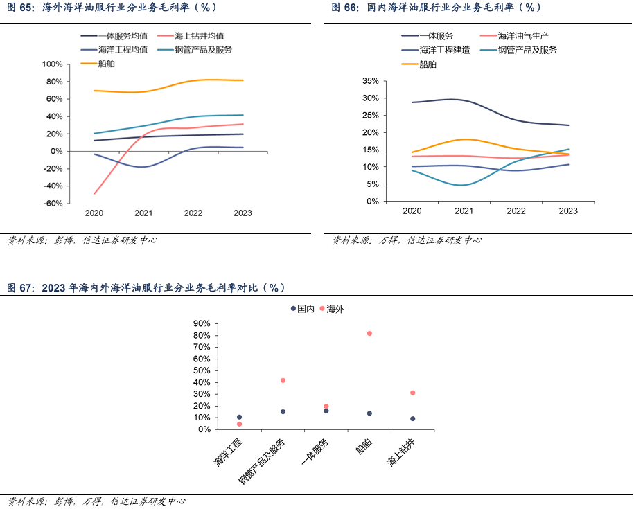 对比来看,我国油服企业出海具备较强的价格和成本优势,对于海洋工程公司可以扩大市场份额,对于其他业务公司可以兼顾扩大市场份额及提高盈利能力。对于海内外油服公司,分产业链位置看,海外上游耗材制造(管件产品等)以及油服支持业务(船舶等)盈利水平较好(与海内外产业价值链结构不同有关),国内一体化服务等技术要求较高的业务盈利水平较高(海外一体化服务盈利稳定,但钻井业务毛利率更高),海洋工程建造业务都处于价值链相对低位。海内外对比看,只有海洋工程业务国内毛利率(海油工程)略高于海外(saipem和subsea7均值),而船舶服务及管件销售利润低于海外,可能与国内供应链较为齐备且原料及人工成本较低有关,一体服务盈利能力与海外相当,钻井业务低于海外主要和国内定价体系以及业主较为单一存在更大议价权有关。