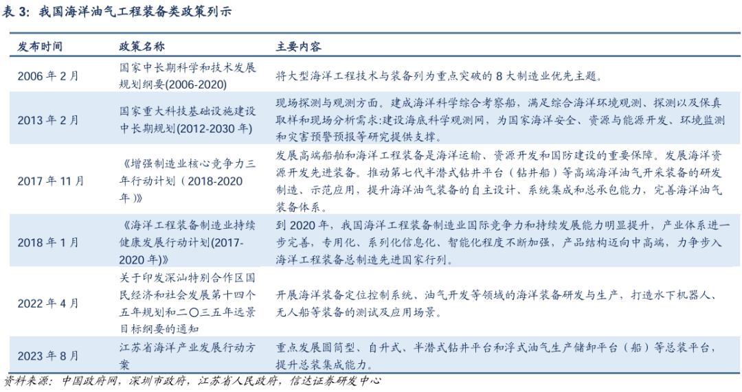 从政策导向来看,国家出台了一系列加快海上油气资源开发和海洋装备技术研发的政策,有利于我国深水油田开发利用。2020年发布的《能源法(征求意见稿)》提出要加快海上油气田开发,2022年《“十四五”现代能源体系规划》提出要坚持海陆并重,在国家政策指导下,沿海各省也纷纷制定自己的海上能源发展规划。与此相匹配的,发展高端船舶和海洋工程装备也纳入国家中长期发展规划中。