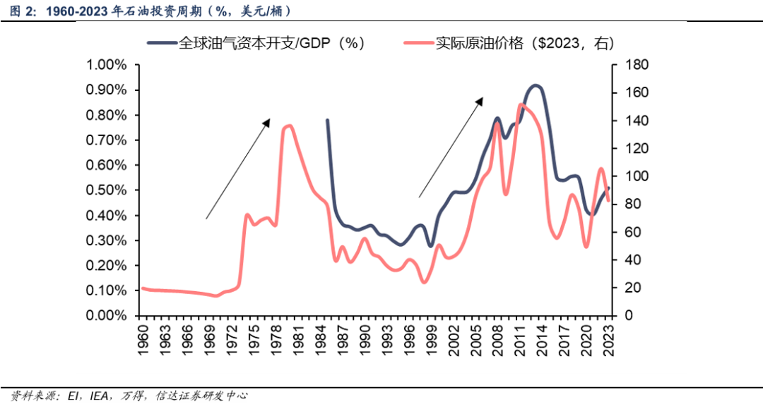 2)石油的繁荣通常会促使新的、非传统的石油供应被引入到市场中,通常是对新领域的勘探或之前被认为没有太大开发价值的油田。随着需求的逐步放缓及供给放量,油价逐步达到高位稳态,此时石油投资仍保持高景气。