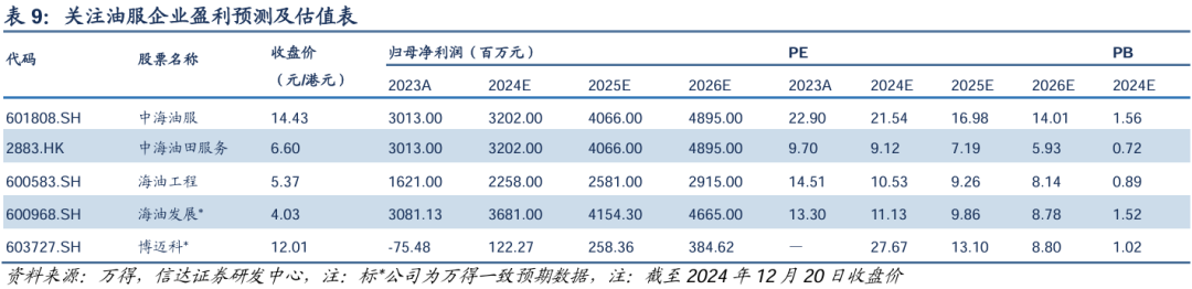 从国内油服估值来看,以中海油服为例,A股相对H股存在100%以上溢价。A股市场看,迪威尔和常宝股份本轮业绩高点已过并且下一轮订单周期未到。另外2024年6月美国财政部把蓬莱巨涛列入SDN清单,或可能严重影响公司海外客户的合作意愿。综合看,海油工程、海油发展、中海油服H股在业绩稳定增长预期下或有估值修复空间。
