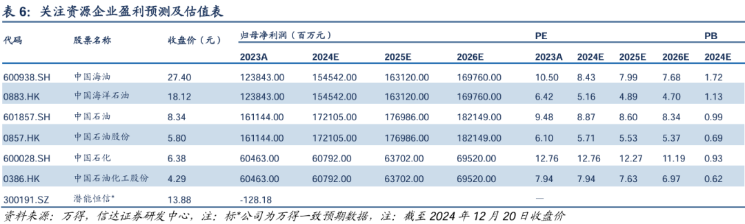 对于资源型上市公司,我们建议关注中国海油(A+H),核心逻辑在于国内外优质资源兑现到产量成长能力、低桶油成本以及估值修复空间大;中国石油(A+H),核心逻辑在于内部挖潜、天然气改革及估值修复 ;中国石化(A+H),核心逻辑在于上游成本改善及估值修复;潜能恒信,公司参与国内准噶尔盆地九1-九5区块(在产,70%权益)、渤海05/31合同区和渤海09/17合同区以及南海22/05合同区(勘探,49%开采权)、南海北部湾涠洲10-3西油田(在产,25%开采权)暨22/04区域合同区(勘探),油田资源较好,未来进入开发后有望迎来产量和利润快速增长,但警惕公司债务杠杆过高和现金流风险。