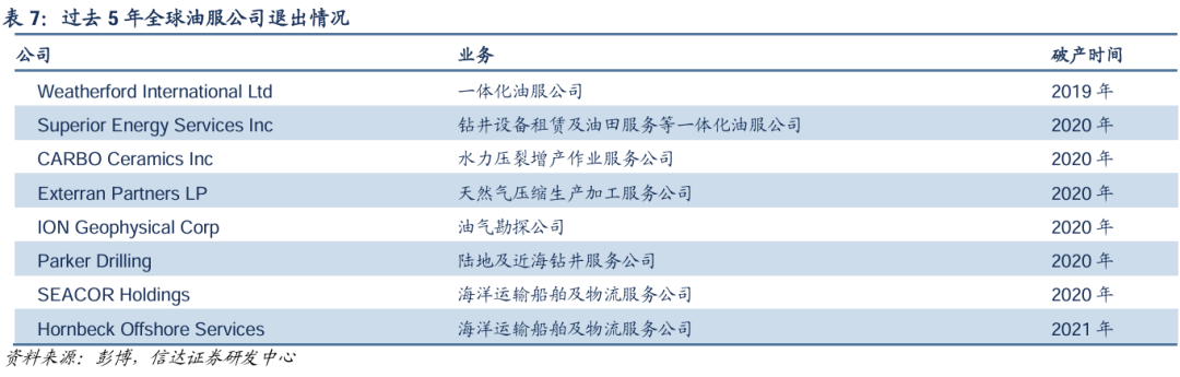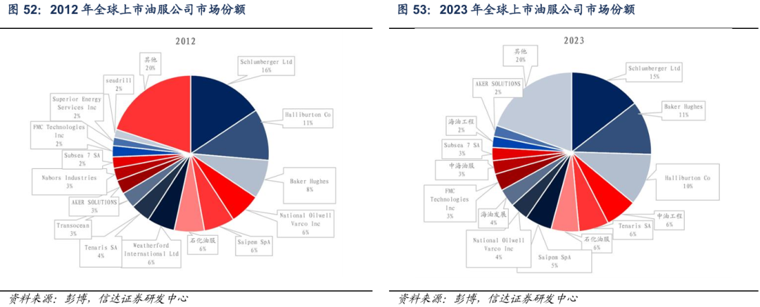 例如,曾经是全球第四大油服公司的Weatherford在2019年申请破产,公司曾表示,能源公司在石油和天然气领域的勘探、开发及生产方面的支出在不断减少,对Weatherford产品服务的需求也在减少,同时公司在周期底部持续并购扩大业务份额并承担大额债务,导致公司2012-2018年业绩持续下滑,最终申请破产重组。与此同时,我国三桶油下属的油服公司在全球范围内市场份额迅速提升。