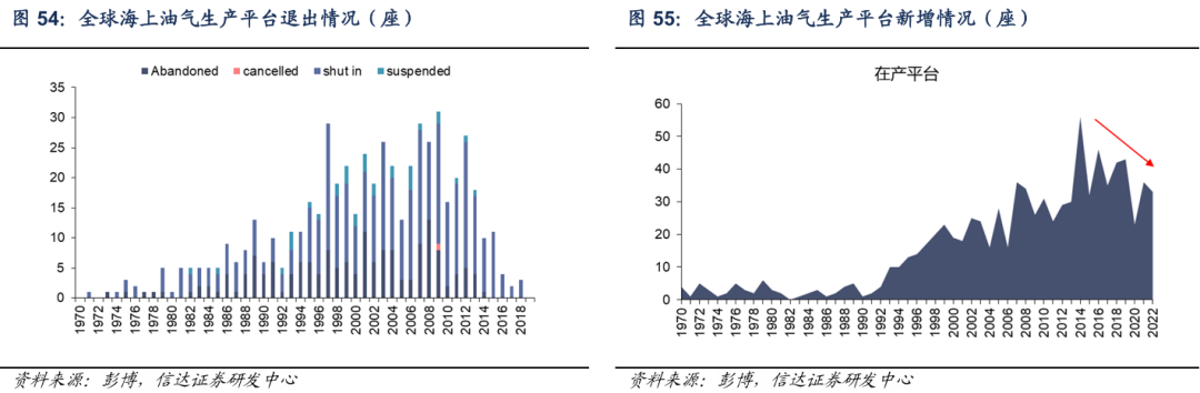 过去20年内,伴随着老旧作业设备退役和油价低迷带来的投资积极性下降,需求不足下油服企业破产或大型施工作业装备退役出清。具体到海上油服,以海上油气生产系统为例,2000-2013年期间,全球海上油气生产系统出现大规模退出现象,主要原因可以考虑1970-1980年北海地区及拉美地区石油开发热潮下的平台退役。而2014年油价大幅下跌使得新建平台投产延迟或新订单量下降,2014-2022年期间,全球海上在运行的生产平台增幅整体下降。