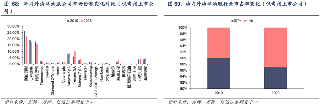 从需求端来看,2020年疫情引发陆上边际石油产区特别是美国页岩油公司退出以及相应油服产业链工作量的下降,伴随着油价回升至中高位水平,我们观察到海洋油服产业市占率出现增长,截至2023年海洋油服产业市场份额(美股上市公司)提升至30%。