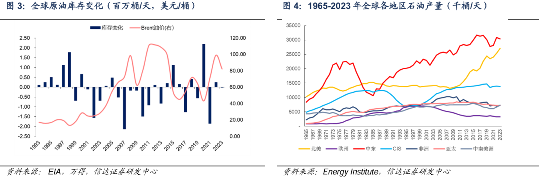 从周期角度看,2000-2008年,21世纪初中国加入WTO带动经济快速发展和原油需求增加,2009年全球主要央行量化宽松货币政策刺激下,世界经济复苏,同时中国经济仍高速发展,期间全球原油保持去库,上一轮被2008金融危机打断的油价又快速回升至100美金/桶以上。中东及俄罗斯地区常规原油供给增量难以匹配需求增量和弥补欧洲北海地区产量持续衰减,高油价促使石油投资升温,推动高开采成本的美国页岩油进入原油供应主流市场。