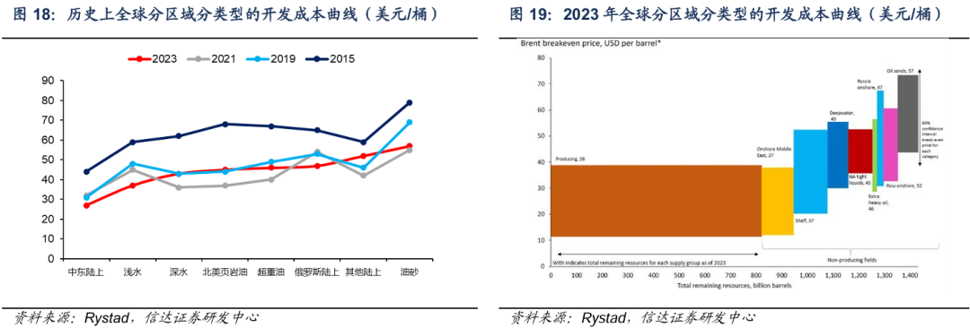 在成本方面,从时间维度看,深水及浅水油田开发的盈亏平衡线分别从2015年的62、59美元/桶下降至2023年的43、37美元/桶。技术进步推动海洋油气开发成本不断下降,截至2023年浅水和深水油气资源平均开发成本仅次于中东陆上油田,甚至略低于美国页岩油,成为未来原油供给端增长的最具备商业开发价值的来源。