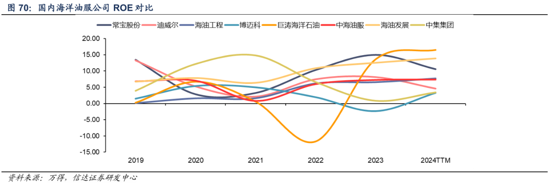 我们统计国内海洋油服产业链权益报酬率变化,通常油服产业业绩改善滞后于油价一年左右。对于国营企业,海油系油服公司自2022年后业绩逐年稳定增长,与中海油持续提高资本开支水平以及公司自身出海战略相关。对于民营企业,设备制造企业率先在2022-2023年实现业绩改善,主要原因在于油价回暖后海内外订单复苏式增长以及设备管材交付周期较短,2024年设备制造企业盈利开始出现回落,主要在于本轮资本开支增长谨慎以及新一轮上游投资周期转换为设备订单周期较长;工程建造类企业则在2022-2023年开始复苏,2024年仍在持续改善,主要受上游业主招标、投标以及订单工期较长影响。