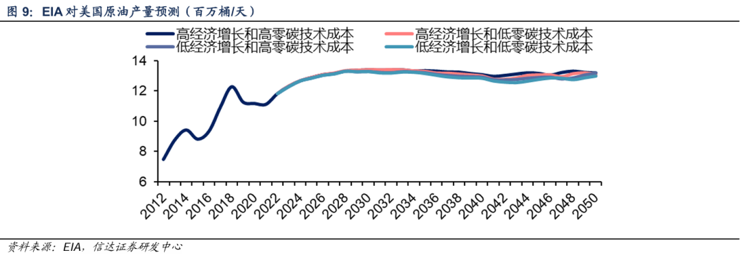 我们认为主要考虑美国页岩油资源开采触及天花板的影响。通常来讲,油田采收率超过50%,其产量或将进入平台期。根据EIA长期预测,在若干经济增长和碳排放情景假设下,美国原油产量最高峰预计在1400万桶/天以下,而2024年美国原油产量平均值已经达到1323万桶/天,未来可增产空间相对有限。