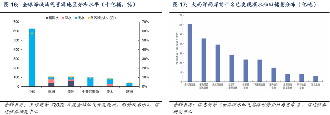 从地区分布来看,浅水油气资源主要集中在中东地区,深水及超深水资源主要集中在非洲和美洲地区。美洲地区主要包括巴西桑托斯盆地和坎波斯盆地、圭亚那盆地、以及北美地区的墨西哥湾深水盆地。非洲地区主要包括尼日尔三角洲盆地、下刚果盆地,以及近10年来新发现深水储量的热点地区莫桑比克鲁伍马盆地以及塞内加尔盆地。