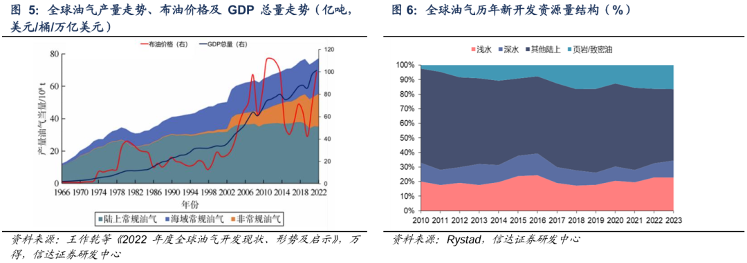 纵观1966年至今,油气产量长期趋势与全球经济发展正相关,油价波动会影响短期油气开发节奏但不会改变长期趋势。我们认为,长期看全球经济持续增长和原油需求仍在增加,油气供给仍需保持正增长,而随着常规陆上油气产量保持平稳,页岩油新开发占比趋于稳定,未来海域特别是深海油气开发有望提速。