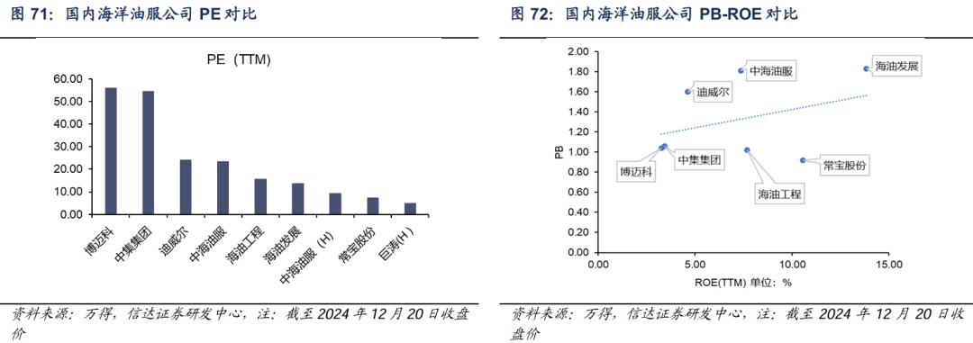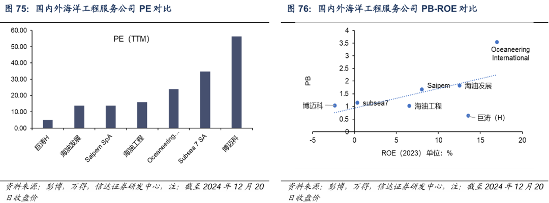 从工程建造产业链角度,水下作业公司整体估值水平高于一般EPCI承包商以及分包商,海油工程可凭借ROE提升扩大估值修复空间,海油发展估值在工程类公司中也仍然偏低。
