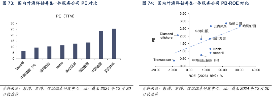 海内外对比看,从钻井&一体化服务产业链角度,一体化服务公司整体估值水平高于钻井公司,中海油服业务介于钻井和技术服务之间,且对于国内市场而言存在技术溢价, A/H股溢价超过100%,H股估值存在修复空间,同时海油发展估值也存在提升可能性。