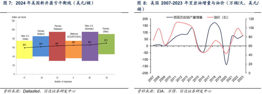 过去10多年,美国页岩油钻探成本较高(2024年平均为64美元/桶),是全球重要的边际供给增量,即油价上升-超过页岩油边际开采成本-页岩油增产意愿增加。