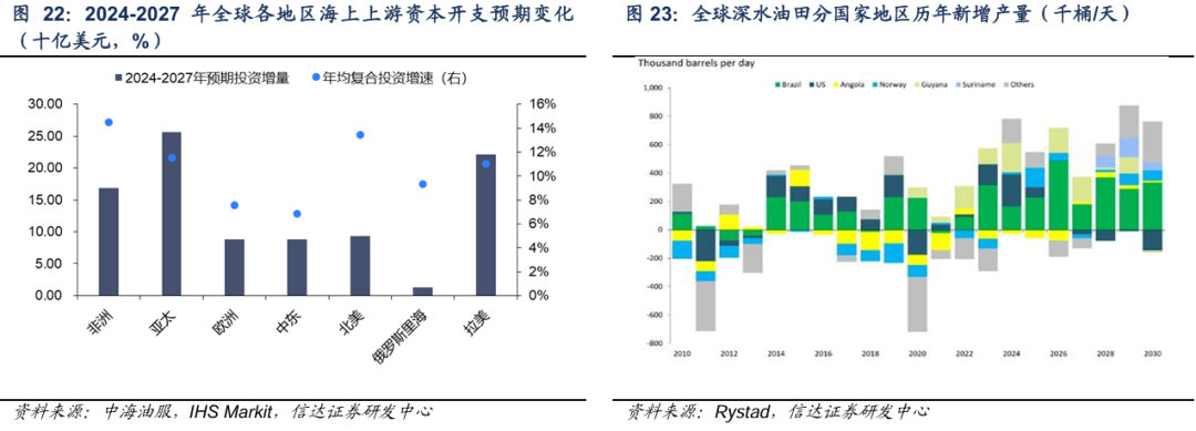 无论是绝对增量还是相对增速,未来海上投资重点区域位于非洲、亚太和拉美地区,亚太地区海上投资以东南亚和中国为主,非洲和拉美则主要集中在深水区域,对应拉美地区巴西、圭亚那和苏里南或实现显著新增产量。