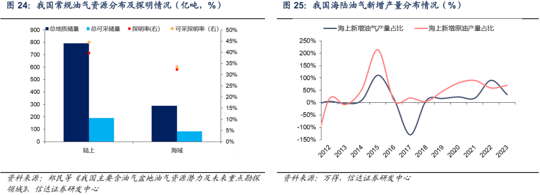 我国陆上油气新增储量增长乏力,海洋油气具备较大勘探开发空间。我国从20世纪50年代开始大力开展陆上油气勘探工作,20世纪80年代才涉足海上油气勘探。据2016年全国第四次油气资源评价,我国常规石油陆上和海域探明率分别为40%和32%,技术可采探明率分别为45%和33%,海上储量探明率低于陆上。我国陆上和海上天然气可采储量分别占比46%和54%,海上天然气储量较大。自2019年7年行动计划之后,我国海上原油新增产量占全国总增量的比例不低于50%,截至2023年,海上新增原油产量占比已经达到70%。