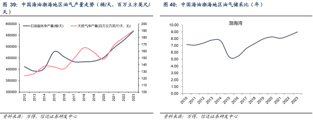 在当前储量发展高峰阶段,渤海油田储量和产量同时实现增长。参考中国海油公开披露数据,我国渤海湾地区油气产量自2019年以来CAGR为6.7%,超过我国2019-2023年的油气产量CAGR4.6%,同时渤海湾油气储采比持续提升至2023年的9倍。