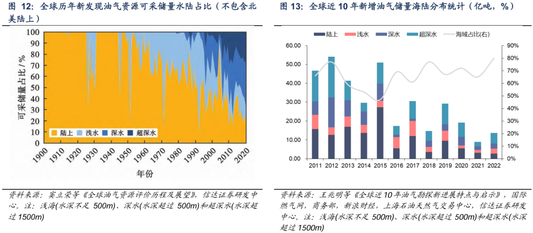 从新发现油气的储量规模来看,海洋油气的储量规模远高于陆地。近10年来,海域新发现的油气储量占全球总量的60%,其中深水—超深水领域发现的油气储量占海域总发现量的61.99%。截至2022年,全球海域新增油气储量占比约80%。