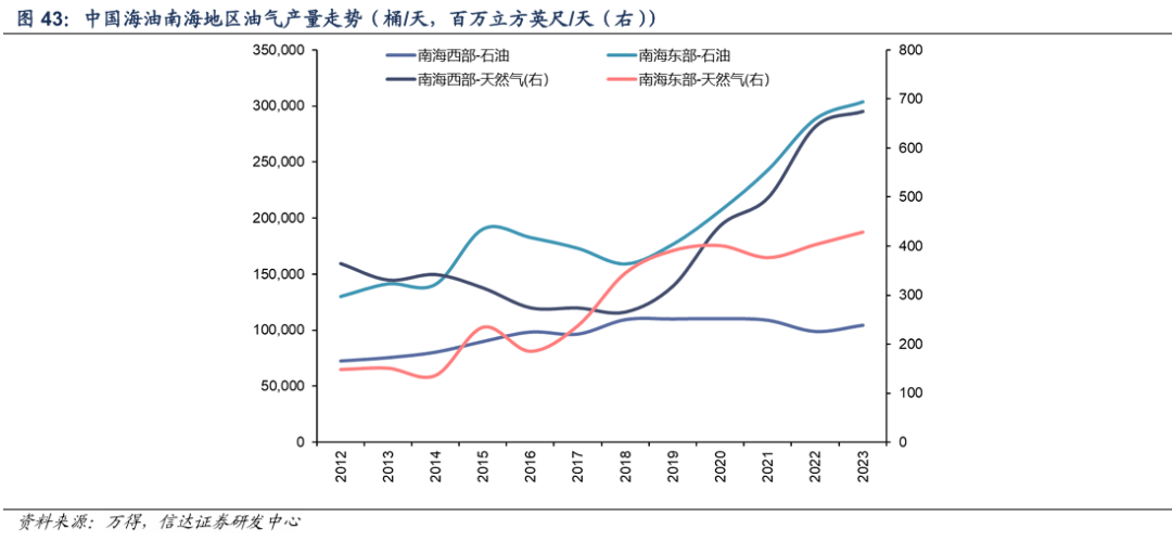 随着我国深水油气勘探开发技术进一步取得突破,包括钻井作业、海底作业以及生产作业水深不断增加,中国海油在南海东部地区、南海西部地区分别建成油田群和大型深水气田,取得了石油、天然气产量的快速增长,参考中国海油公开披露数据,2019-2023年期间,南海东部、南海西部油气产量复合增速分别达到11.6%、7.8%。